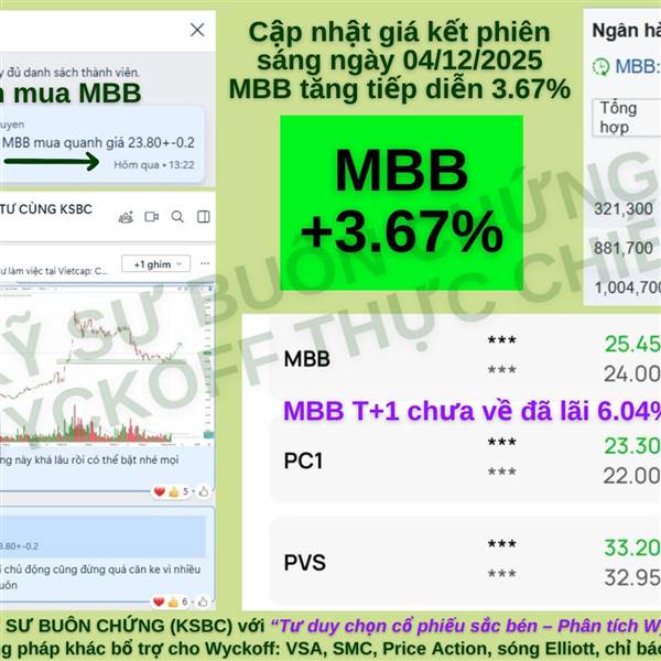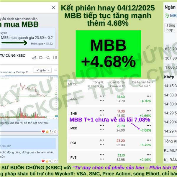 Kết phiên hôm nay (04/12/2025), VN-INDEX vẫn tăng theo đúng kịch bản đã phân tích và siêu bank MBB tiếp tục tăng mạnh phiên thứ 2 liên tiếp mang lại lợi nhuận rất tốt (lãi 7.08% sau 1 phiên) 👇👇👇