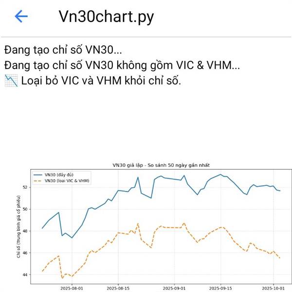 Khi tự lập trình mô phỏng VN30 bằng cách cộng dồn giá của 30 cổ phiếu, tôi nhận ra rằng nếu loại bỏ VIC và VHM – hai mã vốn hóa lớn – thì diễn biến thị trường thực ra...Thêm