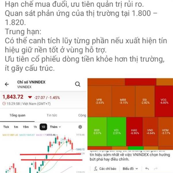 📉 Tóm tắt thị trường chứng khoán hôm nay Thị trường có một phiên giảm mạnh và lan tỏa trên diện rộng. VNINDEX đóng cửa tại 1.843,72 điểm (-27,07 điểm | -1,45%), áp lực bán tập trung chủ yếu ở ngân hàn...Thêm