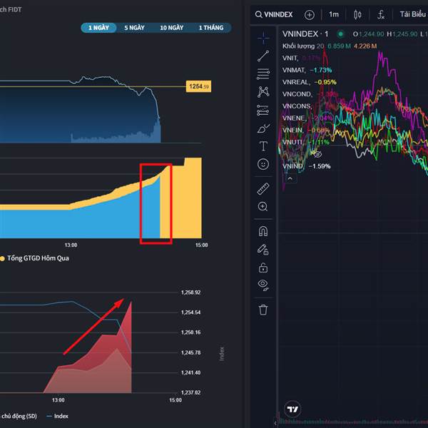 Diễn biến thị trường ngày 6/1/2025 Chỉ số VN-Index. Tham chiếu: 1254.59, mở cửa: 1254.79 giảm 15.12 điểm (-1.19%) so với phiên trước đó. Biến động trong ngày: Chỉ số dao động trong khoảng 1.254,59 - 1.26...Thêm