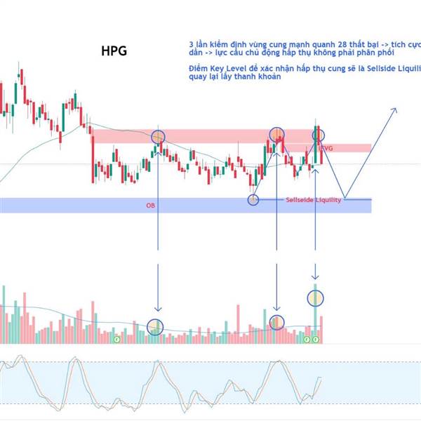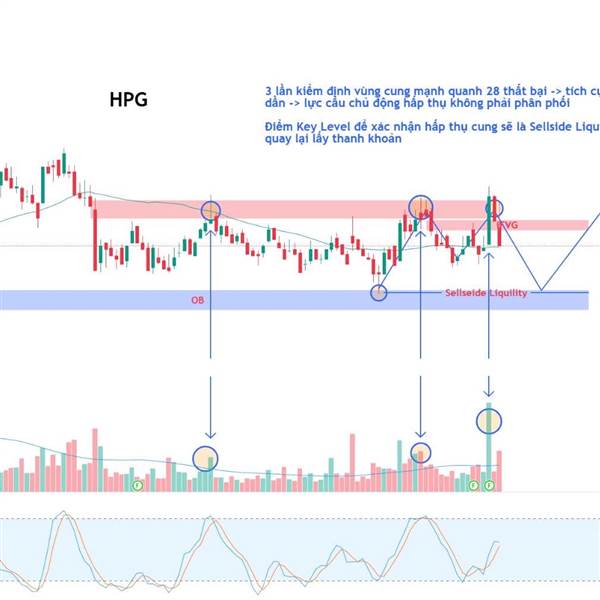 - Giá 3 lần kiểm định vùng cung ~28 không vượt,-> vol tăng dần nhưng giá không gãy sâu → lực cầu chủ động hấp thụ, chưa phải phân phối. - Ưu tiên lấy thanh khoản Sellside Liquidity...Thêm