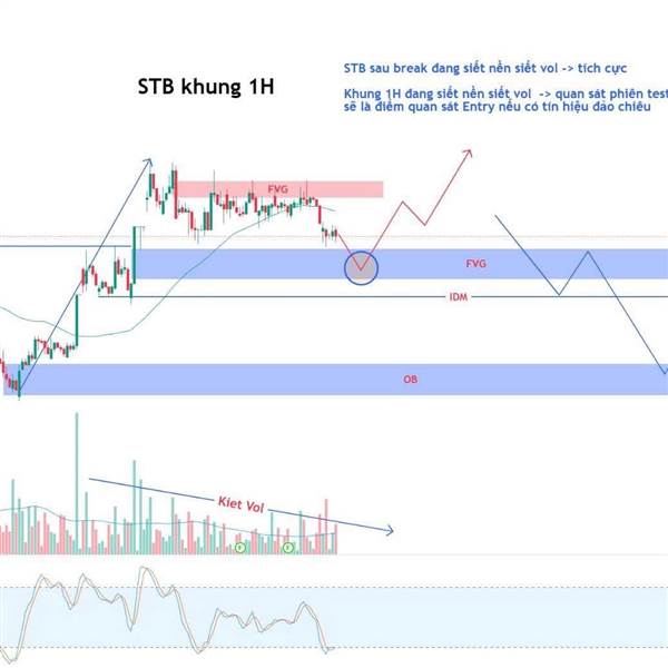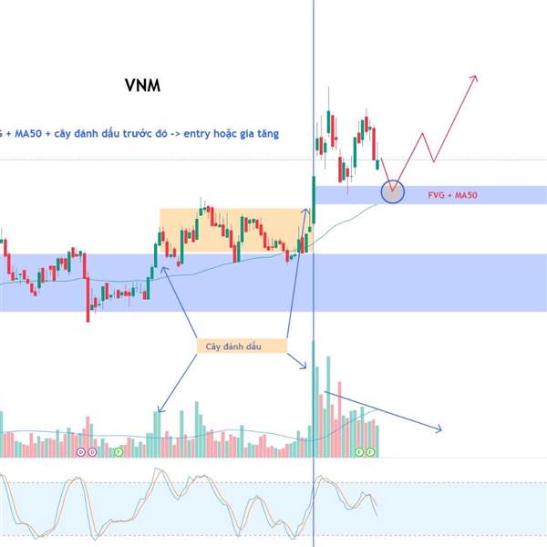 - Giá breakout khỏi nền, xuất hiện các cây đánh dấu + vol tăng → xác nhận lực cầu chủ động. - Nhịp hiện tại kỳ vọng pullback kiểm định vùng hợp lưu FVG + MA50. Quan sát thanh khoản ...Thêm
