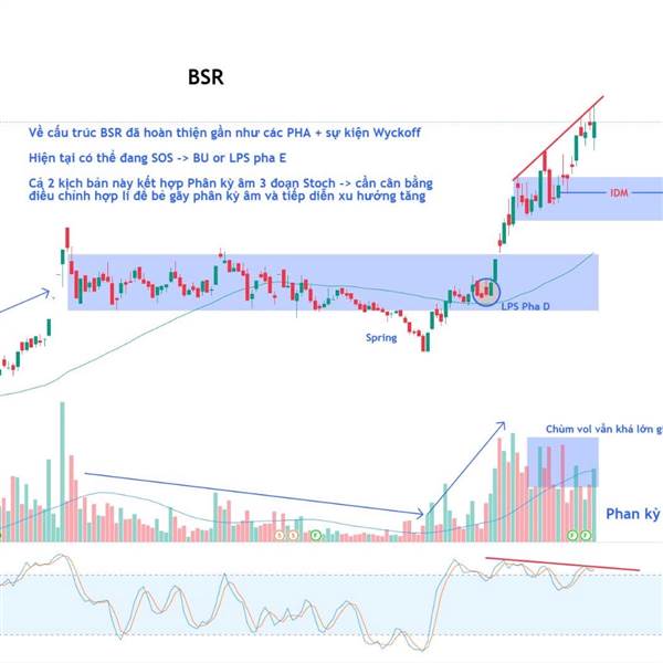 - BSR đã hoàn thiện gần đủ các pha Wyckoff, trước đó có Spring + LPS pha D + SOS, - Hiện tại nhiều khả năng đang ở SOS → BU hoặc LPS pha E. - Chùm vol hiện tại tăng khá lớn nhưng gi...Thêm