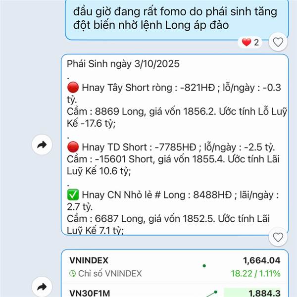 Tổng kết phiên ngày 03/10/2025: VNINDEX kết phiên giảm 6.89 điểm với giá trị giao dịch đạt 24,559.17 tỷ (Volume tương ứng 0.71% Volume trung bình) Tây Short ròng 821 hđ (151 tỷ) và bán mạnh cơ sở 1217...Thêm