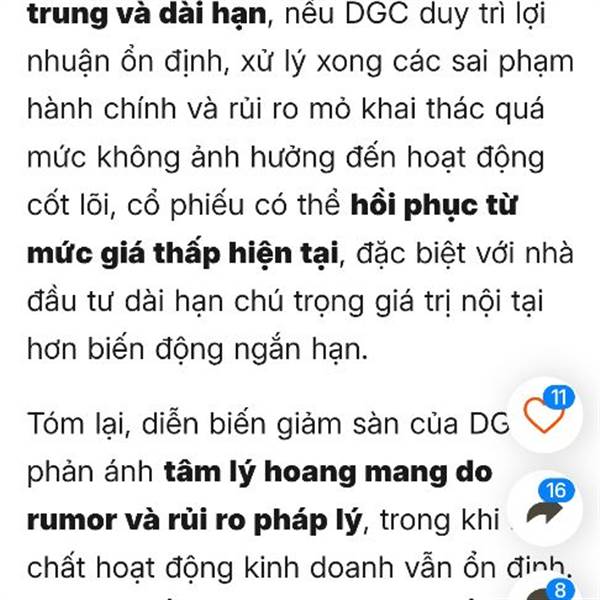 Ko nói nhiều sang tuần sẽ Tím 1 tuần cho cổ đông DGC vui vẻ nhé. Ae hiểu luật thì biết đến h DN chưa ra đính chính t.tin gì thì có thể loại bỏ đc về việc DN dính vào pháp lý h.sự. Vì vậy KB xấu nhất c...Thêm