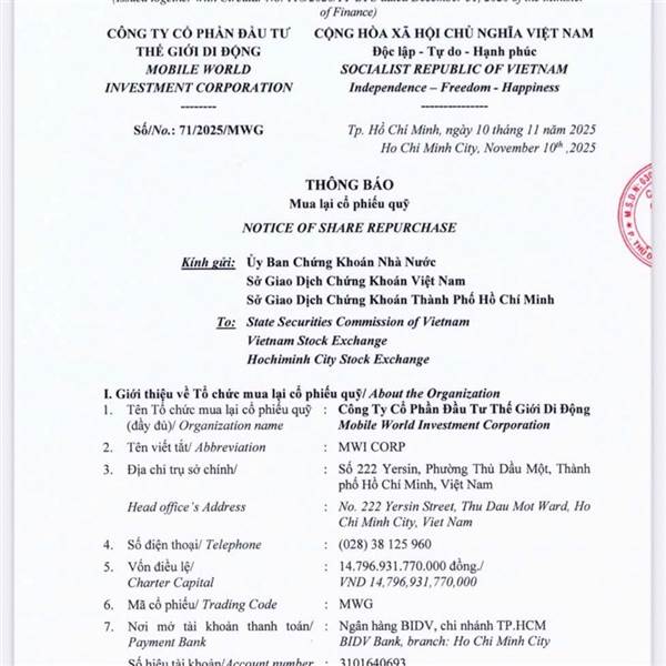 Thế Giới Di Động (MWG) triển khai mua 10 triệu cổ phiếu quỹ, giá tối đa lên đến 200.000 đồng/cp