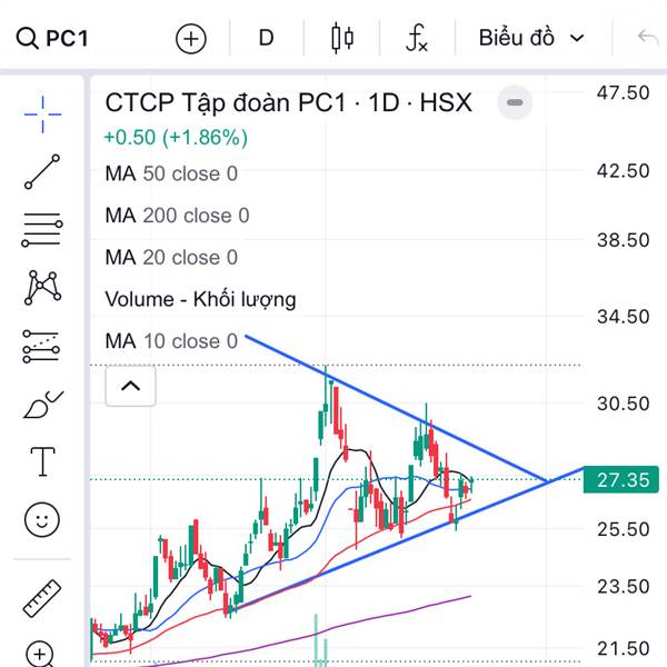 Đáy tăng dần đỉnh thấp dần đợi break nữa là xong