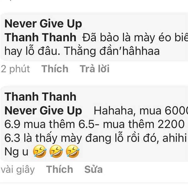 Thằng Ng u, đu 6.9, mua thêm 6.5-6.3, lỗ lòi ra mà cứ đi chửi thằng mua 4.9 chốt lời 7.5 là đần, chả hiểu kiểu gì ...Thêm