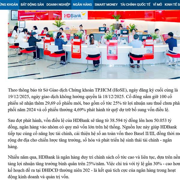 HDBank tiếp tục là ngân hàng đứng vị trí dẫn đầu ROE toàn ngành, đạt 24,71% vào cuối quý III...cổ tức lại cao tới 30% nữa thì chất rồi