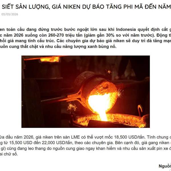 Indonesia có kế hoạch giảm đáng kể hạn ngạch sản xuất tổng thể cho ngành công nghiệp niken của mình vào năm 2026. Chính quyền Indonesia tuyên bố trong tuần này rằng hạn ngạch sản xuất quặng niken quốc...Thêm