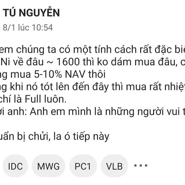 * Anh em chúng ta có một tính cách rất đặc biệt: - Khi VNi về đâu ~ 1600 thì ko dám mua đâu, có mua thì cũng mua 5-10% NAV thôi - Nhưng khi nó tót lên đến đây thì mua rất nhiệt tình, thậm chí là Full lu...Thêm