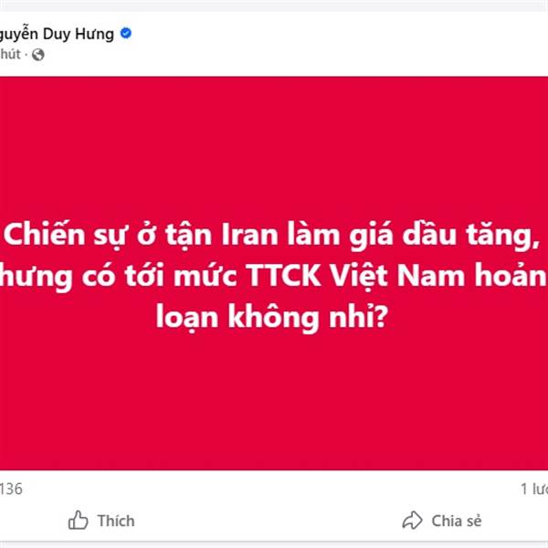Cách thị trường VN và QUốc Tế nói chung phản ứng thì rõ ràng Is+Mỹ đấm Iran KHÔNG PHẢI THIÊN NGA ĐEN Đây là 1 cuộc chiến đã được PR từ rất sớm, tin tức được đưa lên dày đặc có chủ đích. Thậm trí thời đ...Thêm