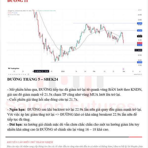 Đường trắng SBE tháng 5 đóng cửa ở mức 21.69$ (-4.7%).