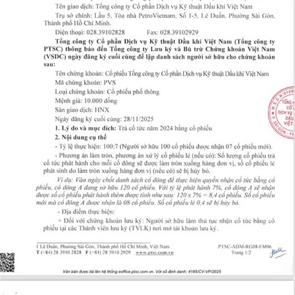 Cổ tức 7% CP chốt đky cuối: 28/11/2025