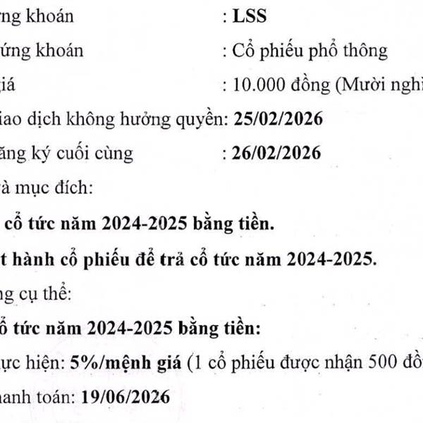Thông tin cổ tức của LSS nếu bạn chưa xem. Nghỉ tết xong là ngày giao dịch không hưởng quyền. 10% cổ tức. 5% tiền sẽ nhận vào ngày 19/6/2026 5% cổ tức cổ phiếu theo như mình thấy Fireant ghi là 26/5/202...Thêm