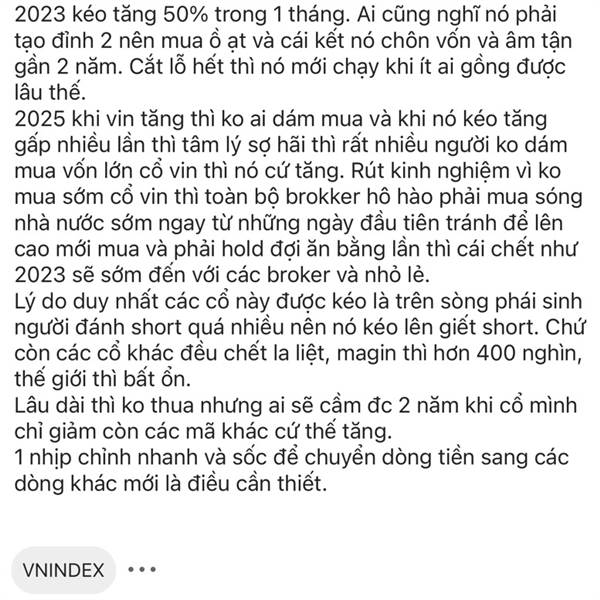 Sóng nhà nước và cái chết của broker + nhỏ lẻ. Vin 24/7 2023 kéo tăng 50% trong 1 tháng. Ai cũng nghĩ nó phải tạo đỉnh 2 nên mua ồ ạt và cái kết nó chôn vốn và âm tận gần 2 năm. Cắt lỗ hết thì nó mới ...Thêm