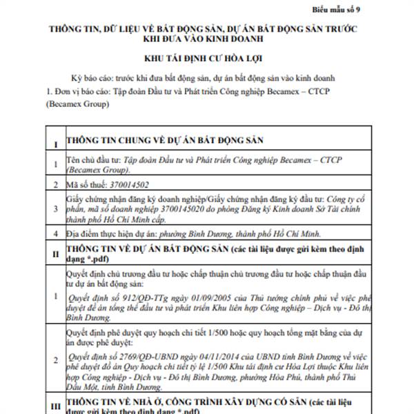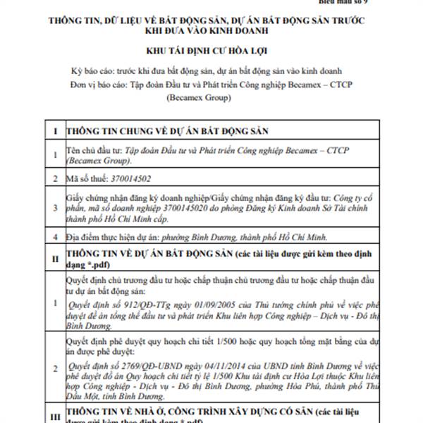 Becamex Group công khai thông tin bất động sản, dự án bất động sản đưa vào kinh doanh – Khu tái định cư Hòa Lợi.