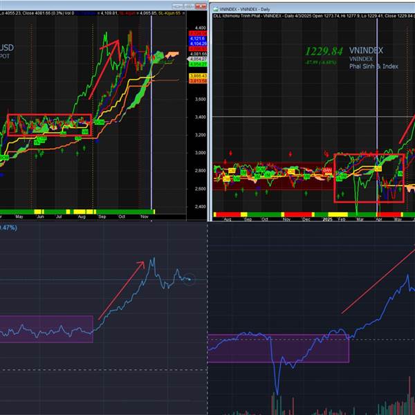 xu hướng vàng và vnindex là tăng nhưng trạng thái vẫn ngược nhau lúc vnindex tích lũy vàng tăng lúc vàng tích lũy vnindex tăng