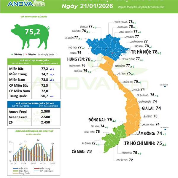 Giá heo hơi hôm nay (22/1), cả nước duy trì xu hướng tăng giá, trong đó miền Bắc tiếp tục giữ vai trò “đầu tàu” khi nhiều địa phương đồng loạt tăng 1.000 đồng/kg, đưa giá heo hơi lên mức cao nhất cả nước là 78.000 đồng/kg. Miền Trung - Tây Nguyên và