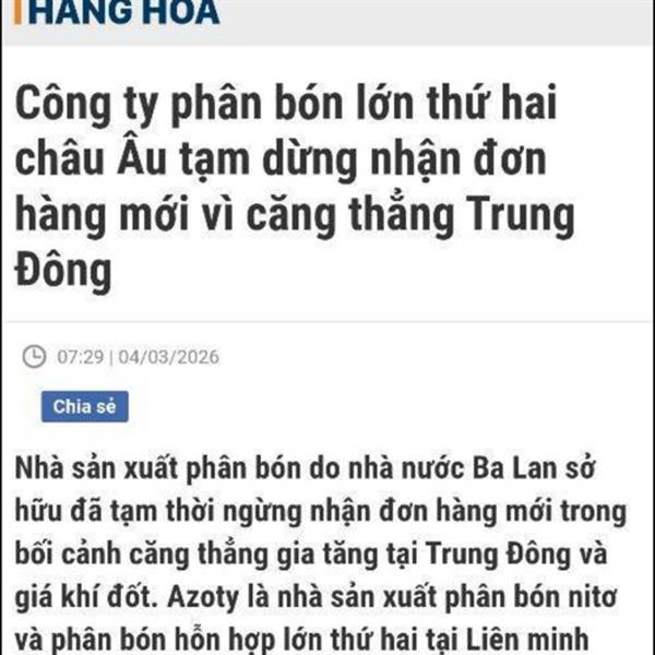Công ty phân bón lớn thứ hai châu Âu tạm dừng nhận đơn hàng mới vì căng thẳng Trung Đông
