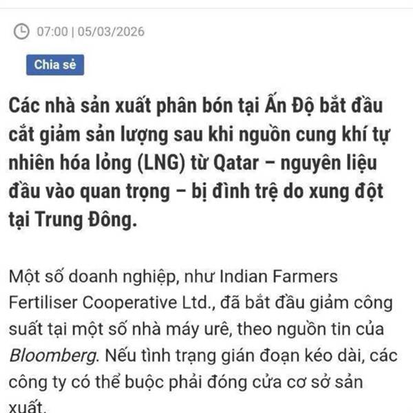Các nhà sản xuất phân bón tại Ấn Độ bắt đầu cắt giảm sản lượng sau khi nguồn cung khí tự nhiên hóa lỏng (LNG) ...Thêm