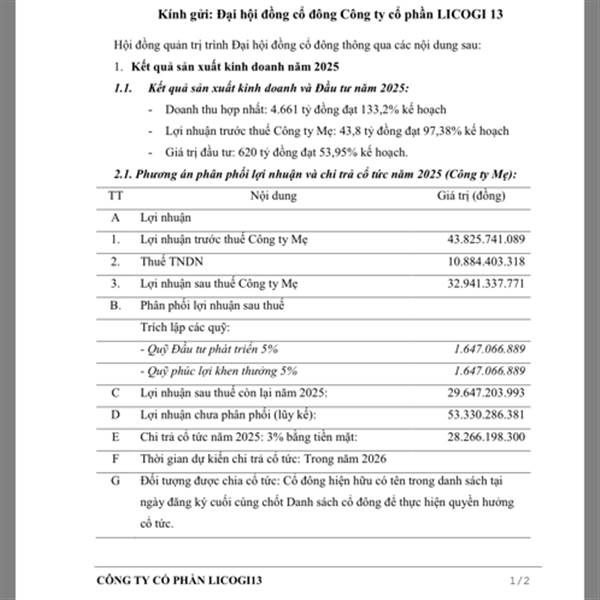 công ty con licogi 13 fc dự tính chi 10% cổ tức - tức 1000đ .công ty mẹ chiếm khoảng 50% . bắt đầu vào thời kỳ hái quả rồi anh em ạ