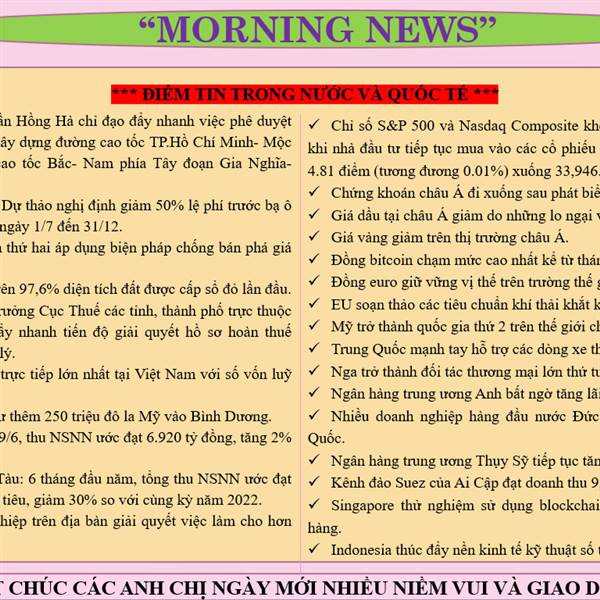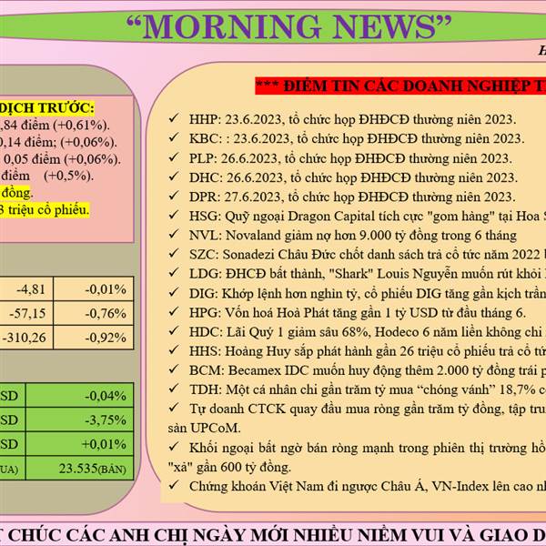 ✅ TTCK ngày 19/06/2023 kết thúc phiên giao dịch VN-Index đạt 1.105,40 điểm giảm 9,82 điểm (-0,88%), trong đó có 113 mã tăng, 315 mã giảm và 45 mã tham chiếu.