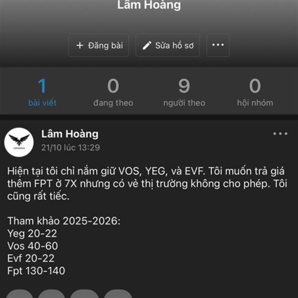 Hiện tại tôi chỉ nắm giữ VOS, YEG, và EVF. Tôi muốn trả giá thêm FPT ở 7X nhưng có vẻ thị trường không cho phép. Tôi cũng rất tiếc.