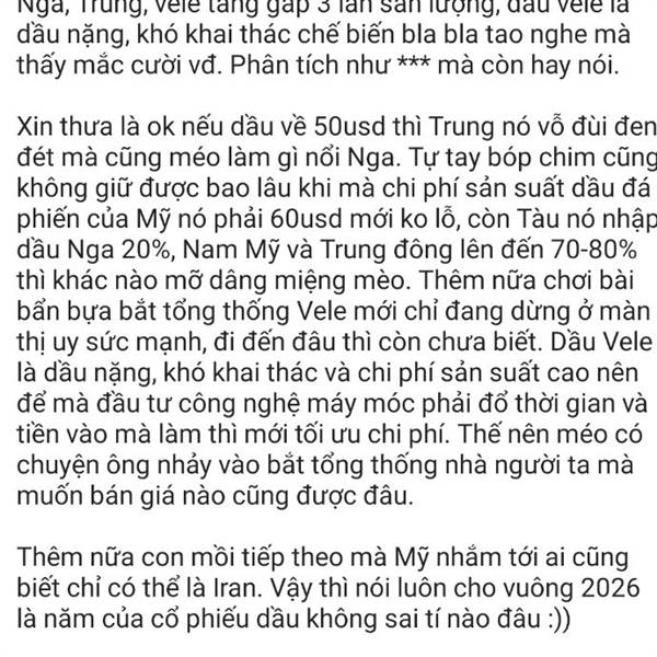 T+/FA Thằng này nói như con vẹt nào là giá dầu sẽ về 50usd 1 thùng chắc nghĩ là Mỹ định làm thế để bóp dáy Nga, Trung, vele tăng gấp 3 lần sản lượng, dầu vele là dầu nặng, khó khai thác chế biến bla bla tao...Thêm