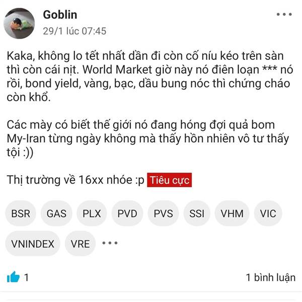 Kaka, không lo tết nhất dần đi còn cố níu kéo trên sàn thì còn cái nịt. World Market giờ này nó điên loạn *** nó rồi, bond yield, vàng, bạc, dầu bung nóc thì chứng cháo còn khổ.