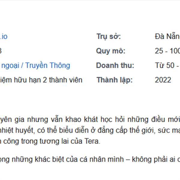 Tụi TERA giới thiệu công ty 25-100 người, xem face chắc tầm 30 người là cao, doanh thu 50 tỷ - 100 tỷ chắc là Yeah1 chuyển cho.