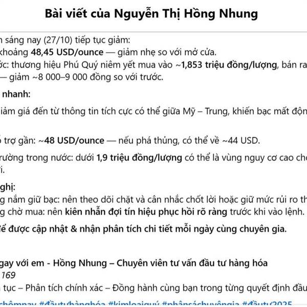 💡 Dựa trên bài phân tích thị trường bạc ngày 27/10, giá đã diễn biến đúng theo kịch bản chuyên gia dự báo: bạc tiếp tục suy yếu và chạm vùng hỗ trợ kỹ thuật quan trọng.