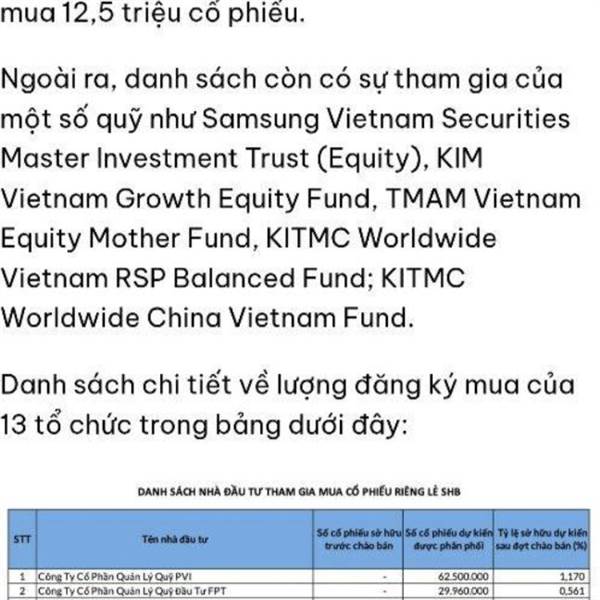SHB phát hành riêng lẻ quy mô gần 3.400 tỷ đồng: 13 tổ chức đăng ký, PVI AM, FPT Capital, VEIL, Hanwha Life cùng nhiều quỹ ngoại tham gia
