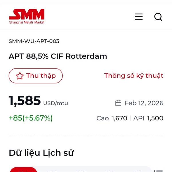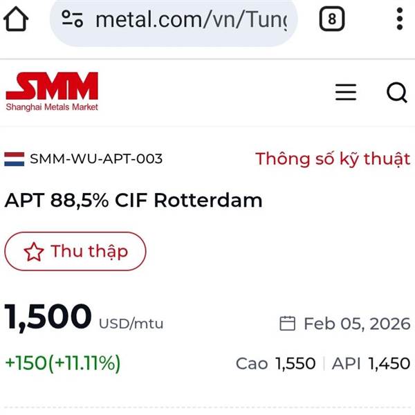 "Vào ngày 9 tháng 2, giá trung bình quặng tinh scheelite (≥65%) đã đạt mức cao kỷ lục 680.500 nhân dân tệ/tấn, cho thấy mức tăng từ đầu năm đến nay là hơn 50%! Giá trung bình của APT (trong nước) cũng...Thêmnews.metal.com/.../103762894-B%C3%ACnh-lu%E1%BA%ADn-SMM-Vonfram-t%C4%83ng-v%E1%BB%8Dt-50-APT-v%C6%B0%E1%BB%A3t-ng%C6%B0%E1%BB%A1ng-1-tri%E1%BB%87u-t%E1%BA%A5n-Th%E1%BB%8B-tr%C6%B0%E1%BB%9Dng-ti%E1%BA%BFp-theo-s%E1%BA%BD-ra-sao
