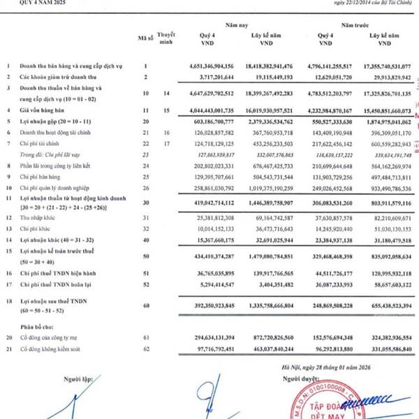 Năm 2025 LNST 1.335 tỷ, phân bổ cho cổ đông VGT 872 tỷ tính ra chia cổ tức tiền ít nhất 15%, nếu tính đúng là 17.4%.