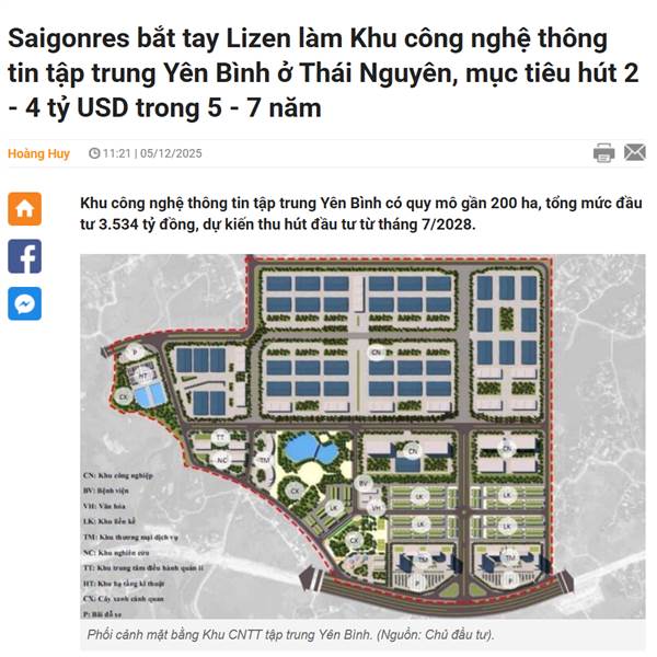 Saigonres bắt tay Lizen làm Khu công nghệ thông tin tập trung Yên Bình ở Thái Nguyên, mục tiêu hút 2 - 4 tỷ USD trong 5 - 7 năm