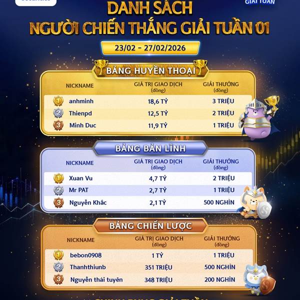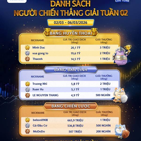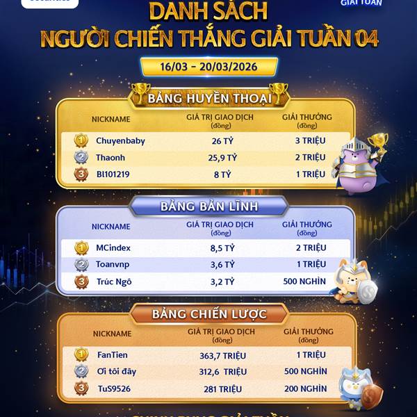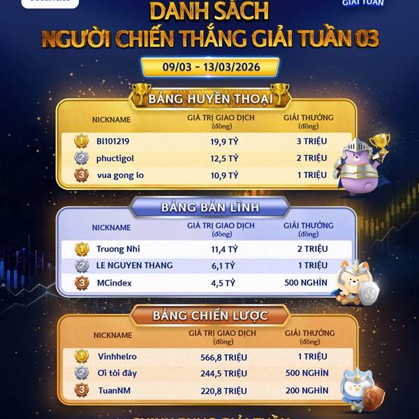 🔥 Sau tuần giao dịch 16/03–20/03 đã diễn ra sôi động và cạnh tranh tại Chứng Trường Huyền Thoại 2026. Những nhà đầu tư xuất ...Thêm