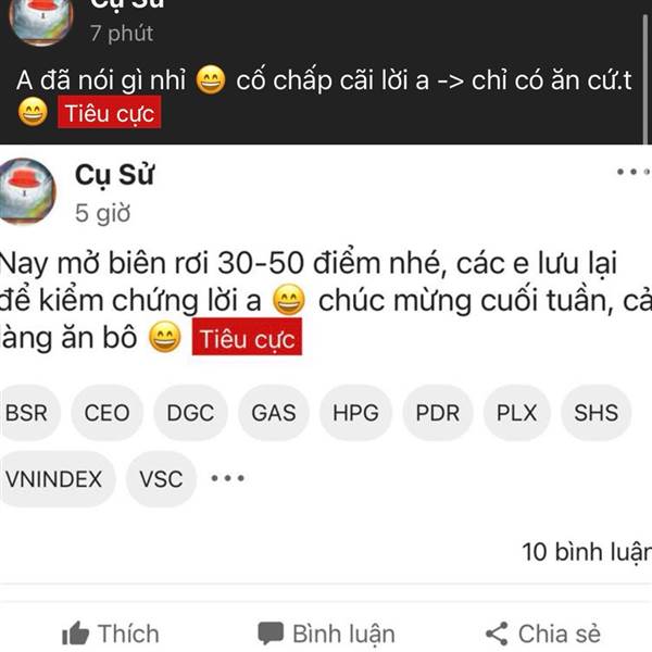 Cụ Sử núp lùm đọc hết các comment đấy ,chỉ là quê quá k dám ló cái mặt lồ.n nó ra thôi,ngày mai chỉ cần vsc đỏ 1-2% là nó ló cái mặt ra cho xem.Mấy thằng này ta.o đọc như 1 cuốn sách