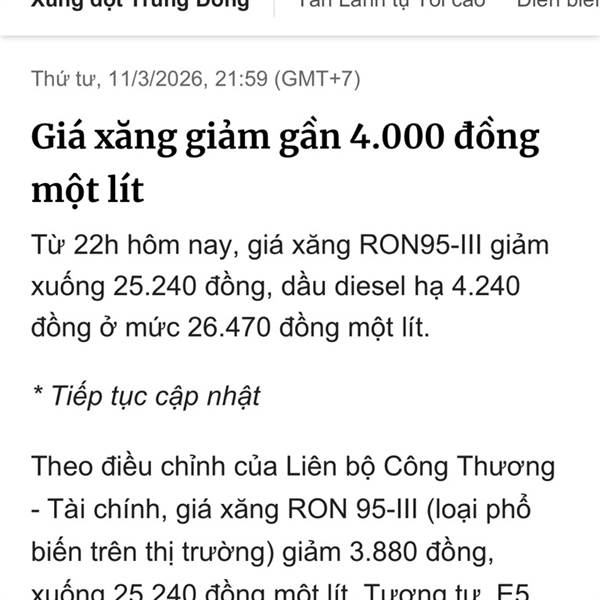 Từ 22h hôm nay, giá xăng RON95-III giảm xuống 25.240 đồng, dầu diesel hạ 4.240 đồng ở mức 26.470 đồng một lít.