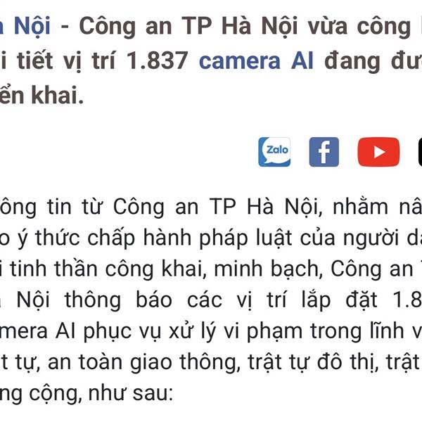 Công an TP Hà Nội thông báo các vị trí lắp đặt 1.837 camera AI phục vụ xử lý vi phạm trong lĩnh vực trật tự, an toàn giao thông, trật tự đô thị, trật tự công cộng