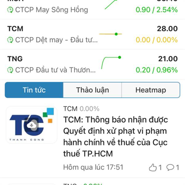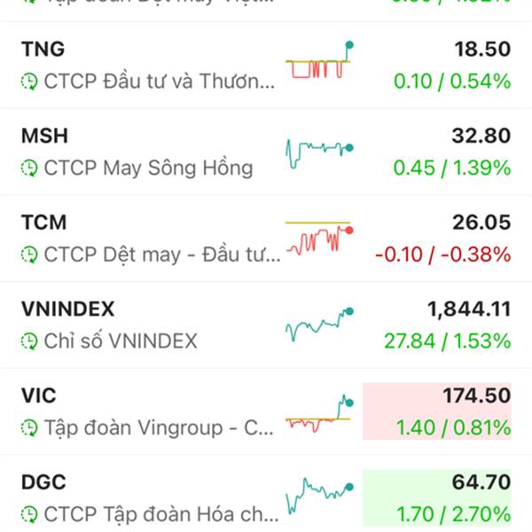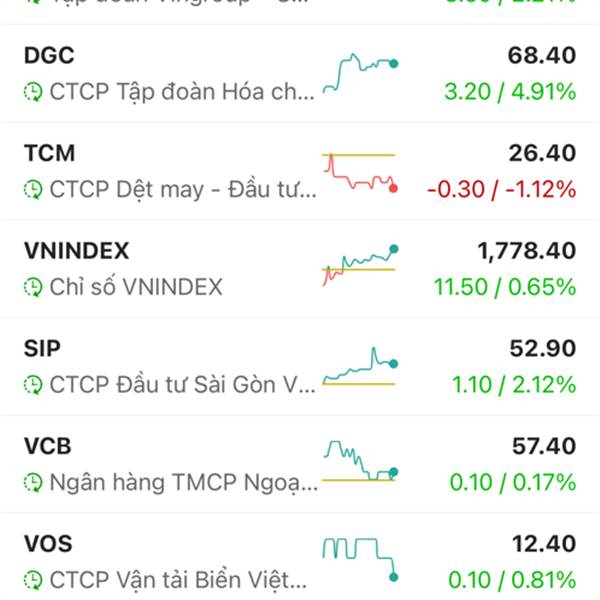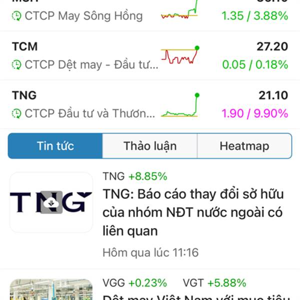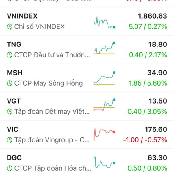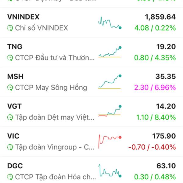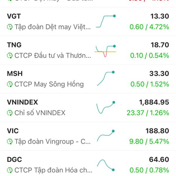 Cả thị trường xanh két...Dệt may xanh két.Các bác đã thấm cái tâm cái tầm của bọn TCM chưa? Nó vẫn đỏ đấy...Ae cổ đông đã thấy các doanh nhân này có tâm có đức thế nào rồi đấy.VGT còn chuẩn bị tím rồi...Thêm