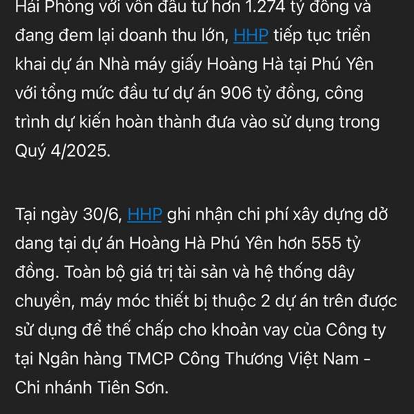 HHP có nghi quyết thoái vốn hết công ty giây hoàng hà hà Nam hiện xong hết thủ tục chuyển nhương từ tháng 8 tưởng quy 3 hạch toán khoản thoái vốn 15 tỉ này Soi báo cáo chưa có nó đang dâu LN khoản này...Thêm