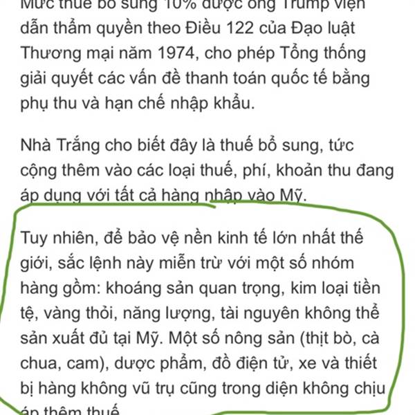 Nói chung thuế Mỹ áp dụng là để đối ứng nội bộ với nhau, chứ ko có đồ ddieenj tử hay là nông sản thuỷ sản.. cũng ko quá ghê gớm, ae cứ bình tĩnh nhé