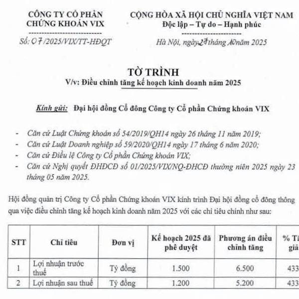 VIX đề trình điều chỉnh mục tiêu kinh doanh teong đó LNST điều chỉnh tăng lên đến 5.200 tỷ. Gần như cao nhất ngành. Tự doanh VIX vẫn đang lãi khá tốt đóng góp lợi nhuận không nhỏ trong đó cầm nhiều EI...Thêm