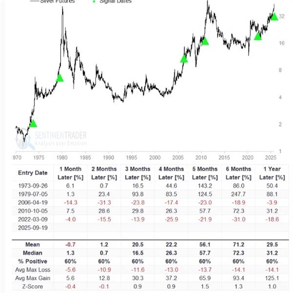 Trong lịch sử, mỗi khi bạc tăng hơn 100% trong vòng 2 năm, giá thường chưa dừng lại ngay. Thống kê cho thấy: