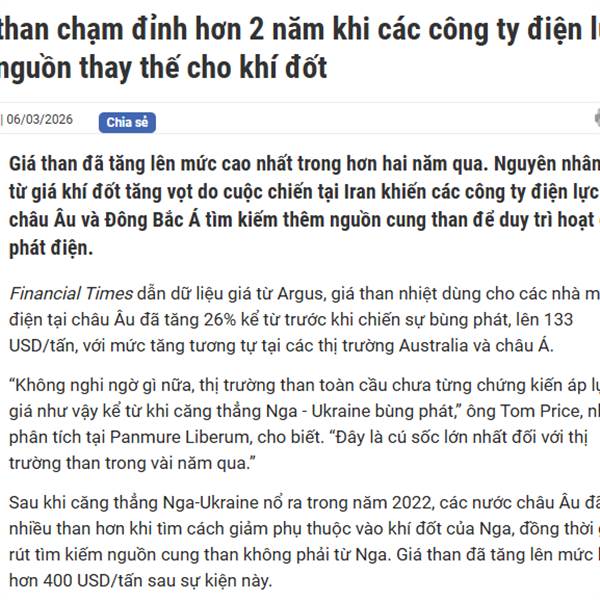 Giá than chạm đỉnh hơn 2 năm khi các công ty điện lực tìm nguồn thay thế cho khí đốt. Dự kiến giá than sẽ còn tăng cao hơn nữa vì không bị ảnh hưởng bởi chiến sự