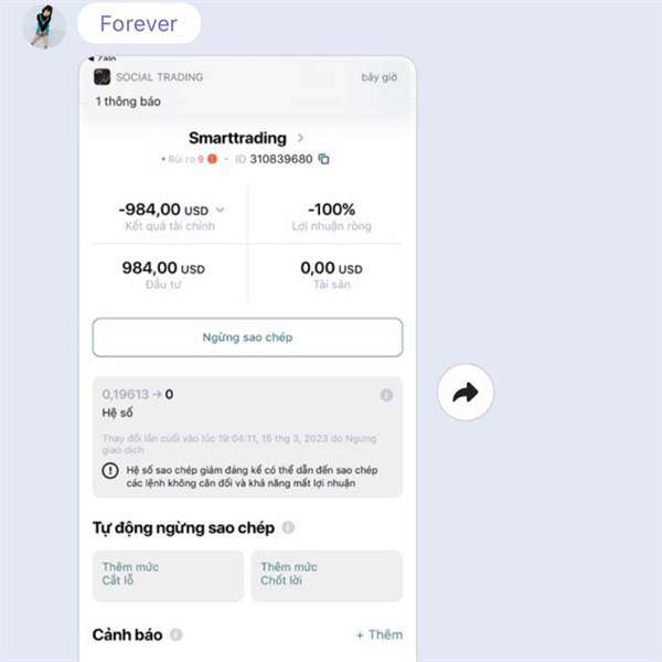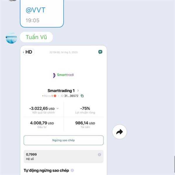 Hiếu Vũ Văn nhóm smarttrading làm cháy tài khoản forex khách con số cực lớn. Lùa từ bot sang coppytrade, rồi từ coppytrade về bot. Mục đích bán khoá học, bán bot. Đội nhóm pro đánh cháy tk khách. Đánh...Thêm