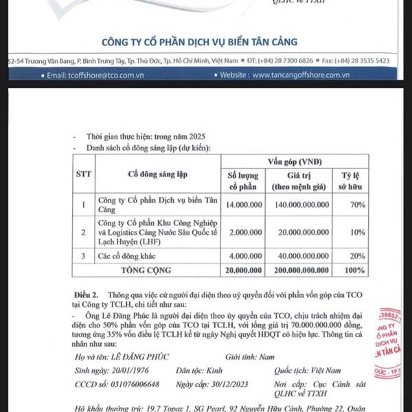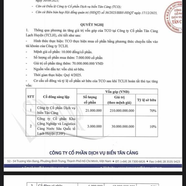 TLH - TÂN CẢNG LẠCH HUYỆN trong văn bản mới nhất đã quyết nghị tăng vốn điều lệ từ 200 lên 300 tỷ đồng, TOS góp thêm 70 tỷ để tiếp tục duy trì tỷ lệ vốn 70% tại TLH.