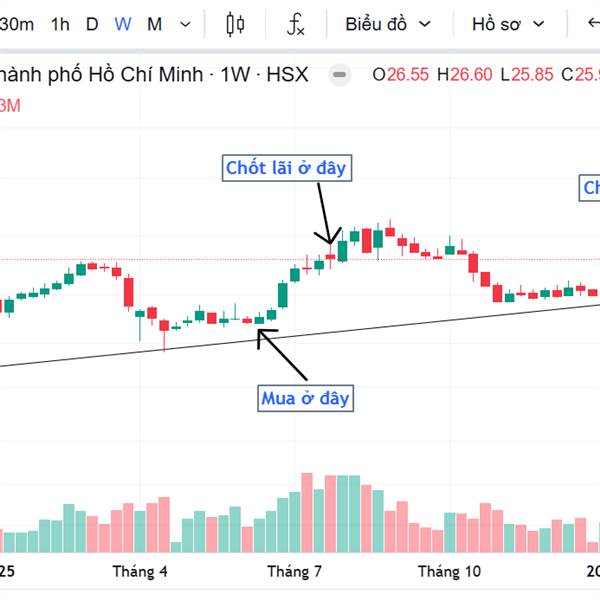 Mình đã mua cổ phiếu HCM ở vùng chân sóng và chốt lãi ở những vùng cận đỉnh => Không đoán đỉnh hoặc đoán đáy => Chờ tín hiệu đảo chiều để đưa ra quyết định.