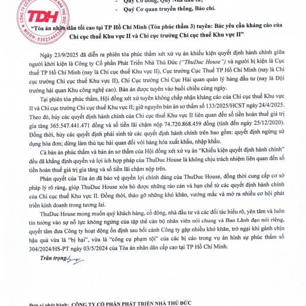 ThuDuc House (TDH) thắng kiện Cục thuế TP HCM trong vụ án hoàn thuế GTGT